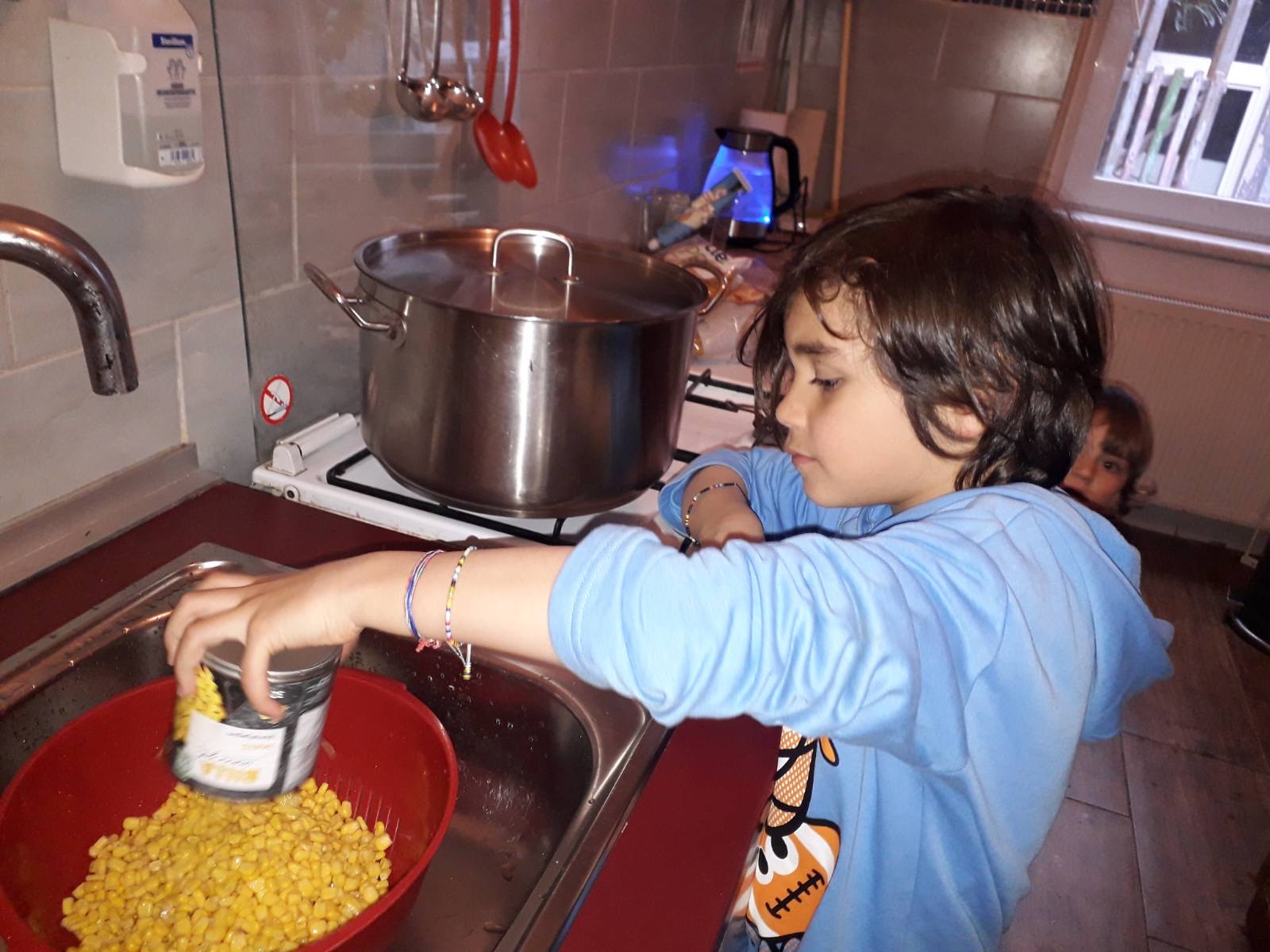 Die Kinder kochen einen Nudelsalat für den Ausflugstag